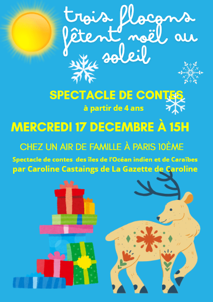 Mercredi 17 décembre à 15h, chez Un air de famille pour le spectacle de fin d’année, Caroline raconte présente « Les flocons fêtent Noël au soleil ». C’est l’histoire de trois flocons qui choisissent de quitter leur nuage glacé du Pôle Nord et accompagnent le Renne du Père Noël pour distribuer les cadeaux aux enfants de la Guadeloupe, d’Haïti, de la Réunion et des îles Comores !